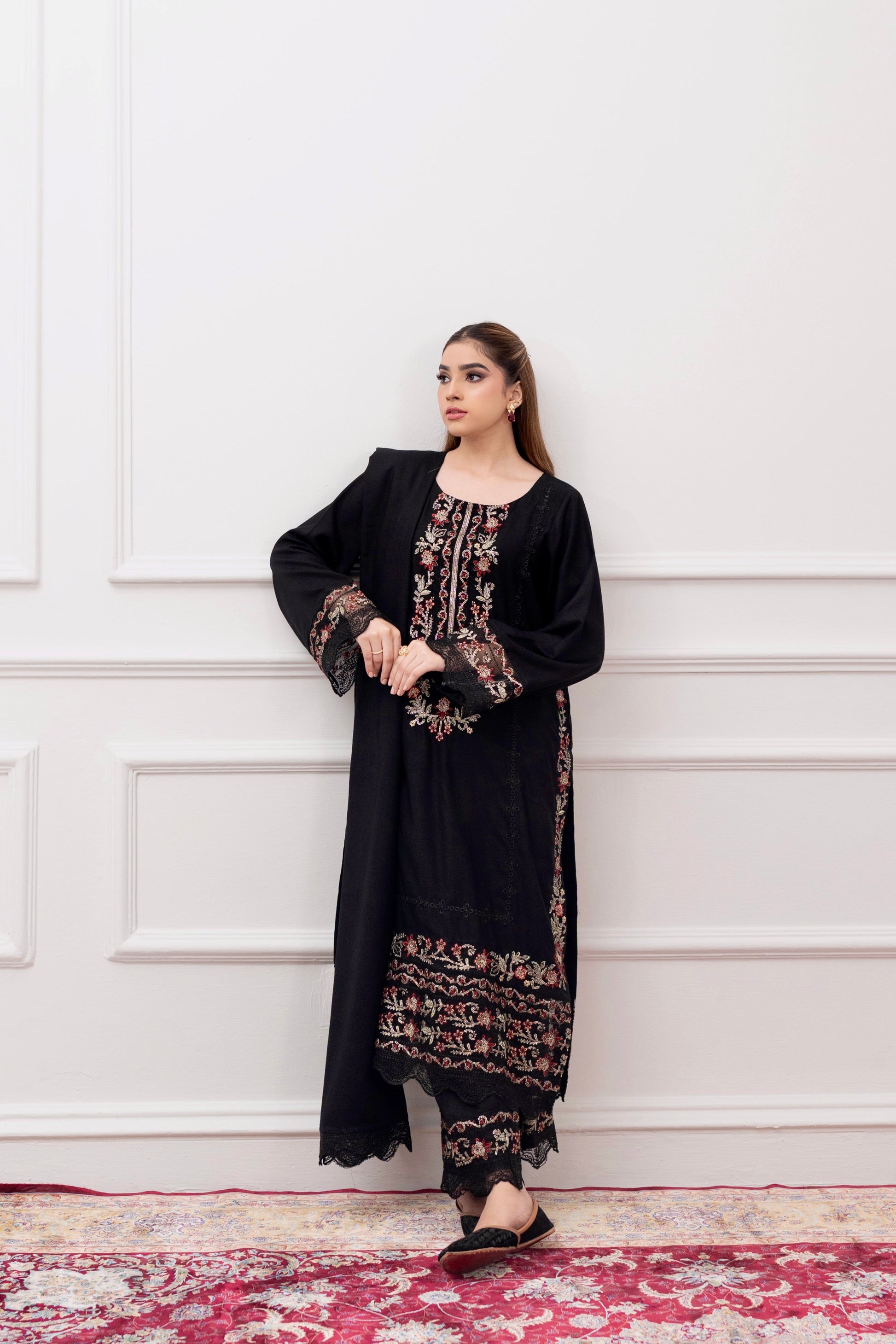 Embrace timeless sophistication with this Karandi Shirt, Karandi Trouser, and Karandi Shawl, exquisitely tailored in deep black to elevate your winter style. The ensemble features embroidered organza patches complemented by delicate embroidery along the neckline and sides for a touch of refined charm.