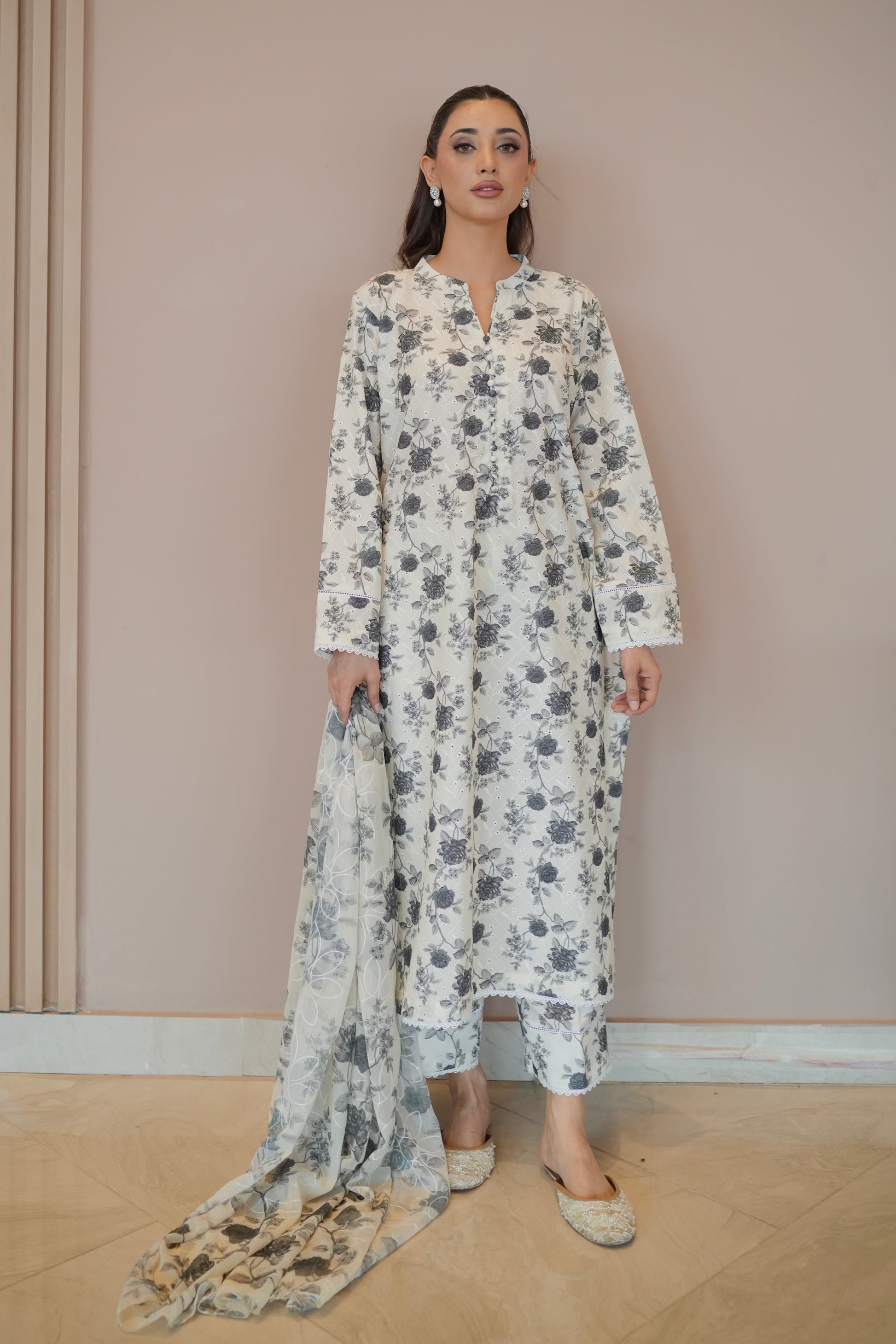 Elevate your wardrobe with this beautifully crafted 3-piece lawn set, designed for both comfort and sophistication. The shirt features intricate all-over embroidery on soft, breathable lawn fabric, offering a perfect blend of tradition and elegance. Paired with a printed lawn trouser for effortless coordination, and a lightweight all over embroidered printed chiffon dupatta that adds a graceful finishing touch. Ideal for both casual gatherings and festive occasions, this set brings timeless charm with a modern edge.